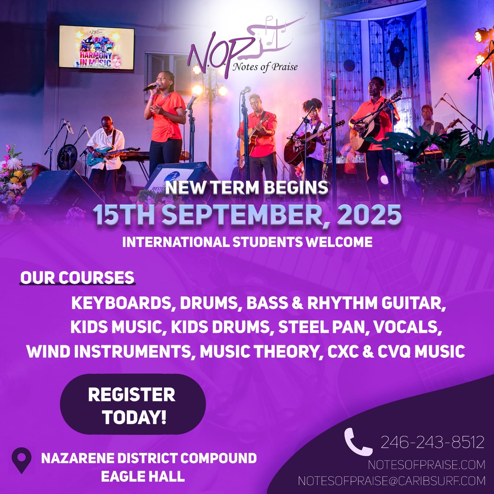 Notes of Praise is a Christian music school registered with the Barbados Accreditation Council, the Ministry of Culture, Sports and Youth as a Cultural Practitioner and the TVET Council as an N/CVQ Centre. Notes of Praise is the first Barbadian institution to be approved to offer the CVQ in Musical Performance Level 2.